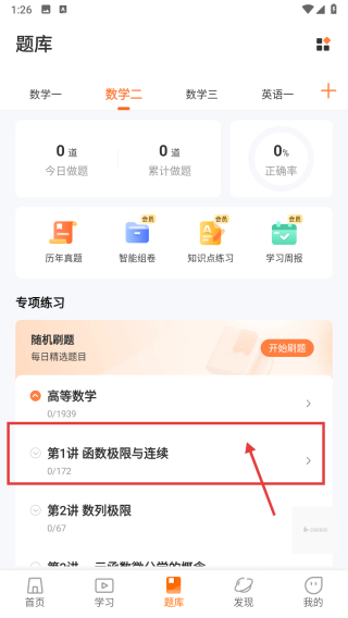 4、在高等數(shù)學(xué)知識點(diǎn)列表頁面,選擇第1講函數(shù)極限與連續(xù),進(jìn)行該知識點(diǎn)的練習(xí)。