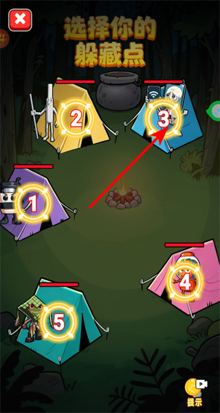2、在選擇你的躲藏點(diǎn)界面點(diǎn)擊帳篷,可確定藏身位置,這是躲避追捕的基礎(chǔ)操作,需考慮帳篷隱蔽和周邊環(huán)境。