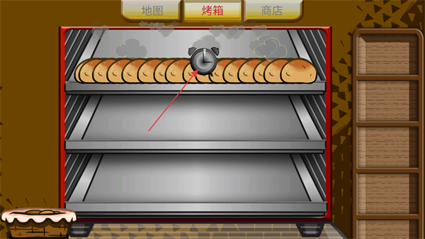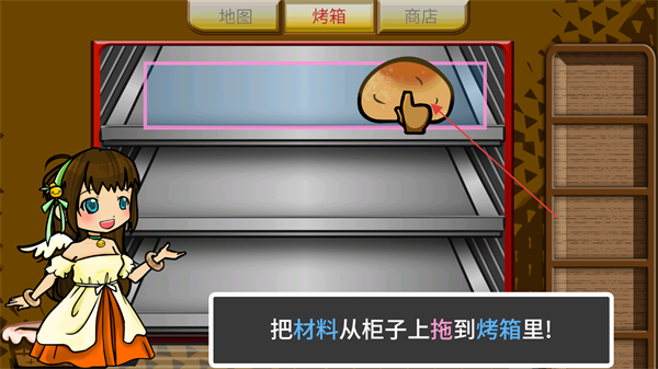 2、選擇到烤箱界面,長(zhǎng)按屏幕把右側(cè)的面包拖動(dòng)到烤箱中進(jìn)行烘烤。