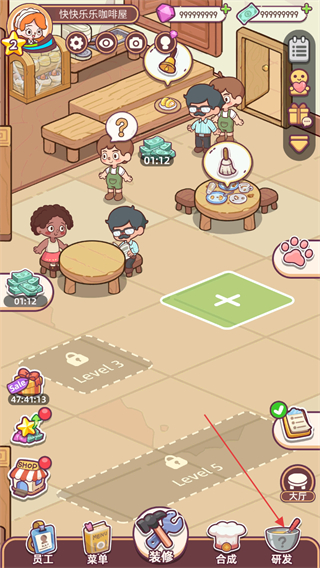 2、在餐廳大廳頁(yè)面,點(diǎn)擊右下角的研發(fā)按鈕進(jìn)入研發(fā)界面開(kāi)啟菜品研發(fā)。