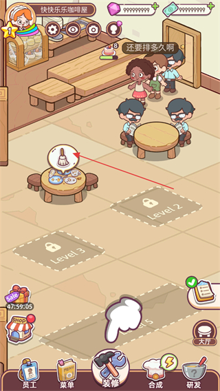 3、顧客用餐需要一定的時(shí)間,通過點(diǎn)擊餐桌也可以加速用餐時(shí)間,完成用餐后點(diǎn)擊圖標(biāo)進(jìn)行收銀。