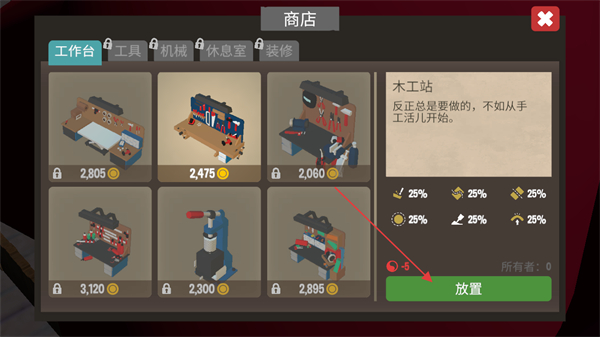 2、進(jìn)入商店界面,選擇合適的工作臺如木工站,點(diǎn)擊放置將其布置在工廠內(nèi),拓展工廠的生產(chǎn)能力。
