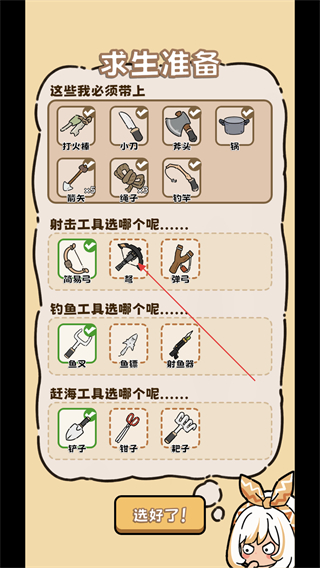2、除了必須帶上的物品之外,我們還要選擇其他的工具,比如射擊工具、釣魚工具等。