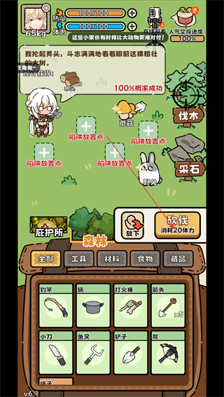 4、點(diǎn)擊下方工具中的斧子,然后點(diǎn)擊砍伐按鍵消耗20點(diǎn)體力值獲取3塊木頭。