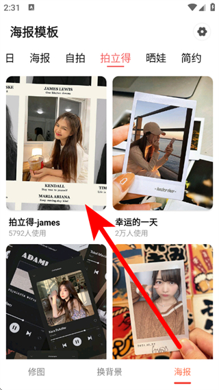 2、在海報(bào)模板頁(yè)面,在拍立得分類,點(diǎn)擊目標(biāo)模板。