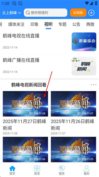 1、在云上鶴峰APP的首頁,點擊頂部的視聽選項,進入視聽頁面。