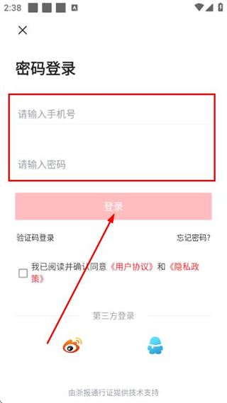 3、在密碼登錄頁面填寫手機號和密碼,勾選協(xié)議后,點擊登錄按鈕完成賬號登錄操作。