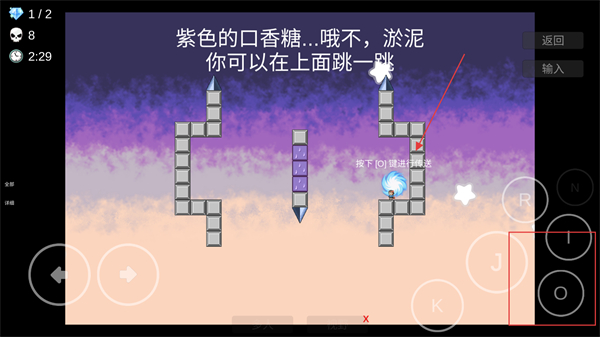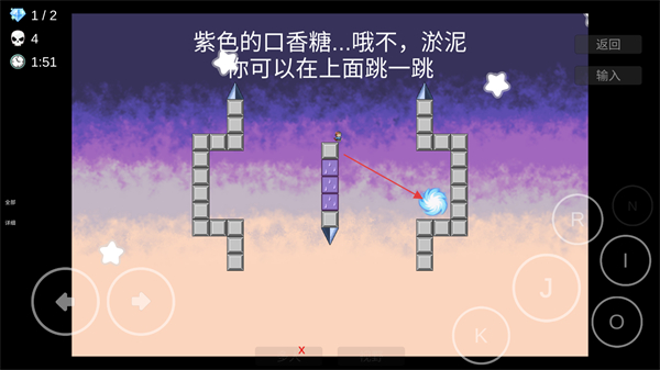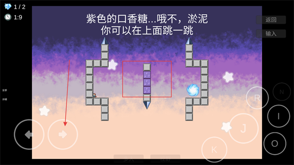 2、進入關卡后,控制角色向右移動,跳至紫色淤泥方塊上。