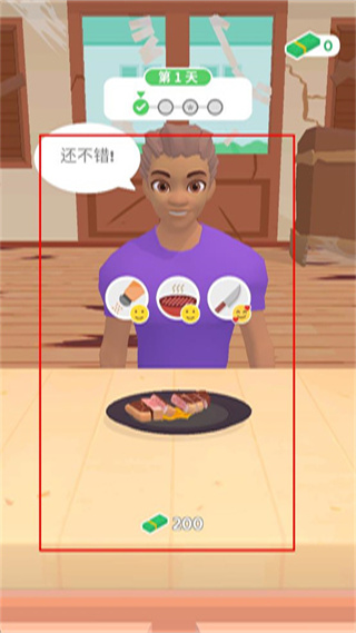 4、完成制作后,將牛排呈上,獲取對(duì)應(yīng)的評(píng)價(jià)和200的獎(jiǎng)勵(lì),結(jié)束本次制作。