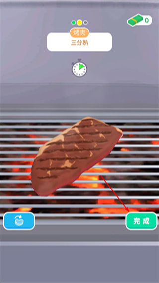 3、進(jìn)入烤肉環(huán)節(jié)后,待牛排烤至三分熟狀態(tài),點(diǎn)擊界面右下角的完成按鈕。