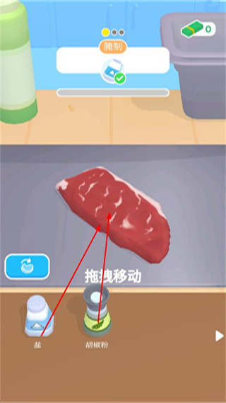 2、在腌制步驟中,拖拽鹽和胡椒粉到西冷牛排上,完成腌制的操作要求。