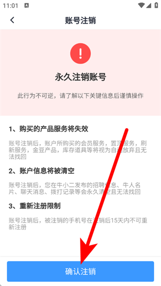 5、閱讀注銷風險提示后,點擊確認注銷,完成賬號注銷操作。