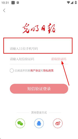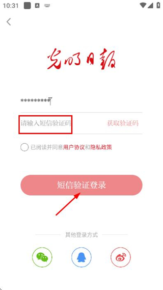 3、在驗證碼輸入框中填寫收到的驗證碼,點擊短信驗證登錄完成賬號的登錄操作。