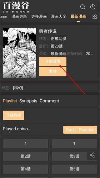 3、在勇者傳說的詳情頁面,點擊開始觀看按鈕,進入該漫畫的閱讀界面。