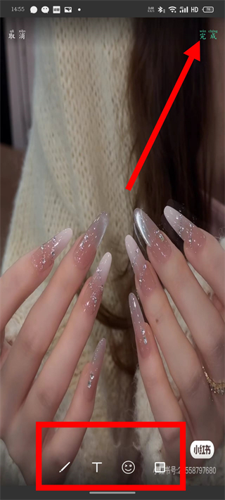 3、在編輯頁面,點(diǎn)擊底部的文字貼紙等工具,添加內(nèi)容并完成編輯后,點(diǎn)擊完成。