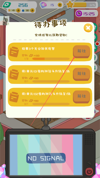 1、在待辦事項界面,選擇招募3個無業(yè)游民房客并點擊前往,推進該任務。