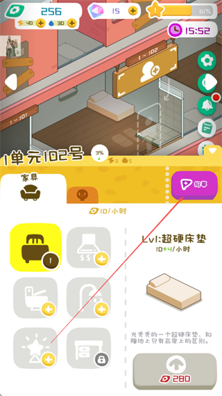 2、在房間界面,選擇家具如超萌床墊進行布置,提升房間等級。