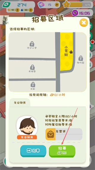 3、進入招募區(qū)域,選擇無業(yè)游民房客,點擊招募按鈕發(fā)起招募。