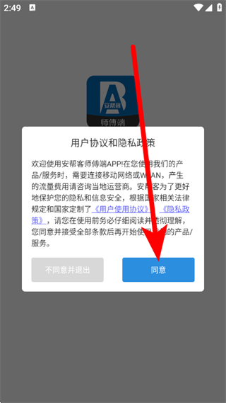 1、打開安幫客,在彈出的用戶協(xié)議彈窗中,點(diǎn)擊同意。