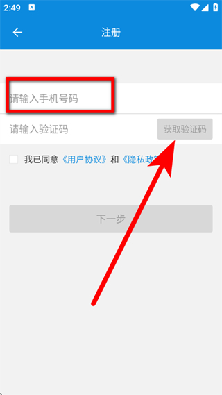 3、在注冊頁面,輸入手機(jī)號碼,點(diǎn)擊獲取驗(yàn)證碼。