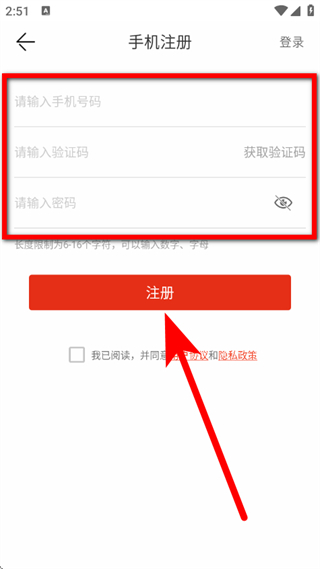 4、輸入手機(jī)號(hào)碼和驗(yàn)證碼、設(shè)置密碼,勾選協(xié)議后,點(diǎn)擊注冊,完成賬號(hào)注冊。
