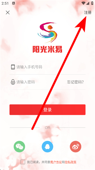 3、在登錄頁面,點(diǎn)擊右上角的注冊,進(jìn)入手機(jī)注冊頁面。
