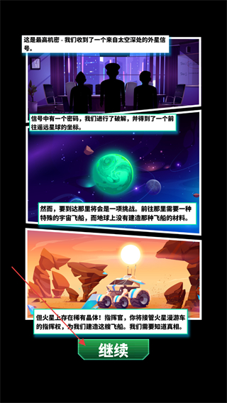 1、開局通過動畫了解劇情得知需前往遙遠星球但缺乏飛船材料,火星存在稀有晶體,需接管火星漫游車指揮權(quán),點擊繼續(xù)按鈕即可進入游戲環(huán)節(jié)。
