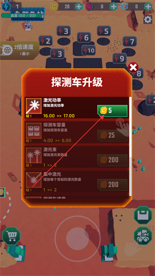 4、獲得足夠金幣后,進入探測車升級界面,消耗對應(yīng)金幣可提升激光功率、探測車容量等屬性,以此增強探測車的作業(yè)能力。