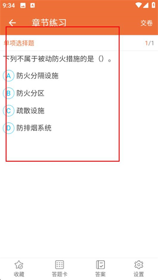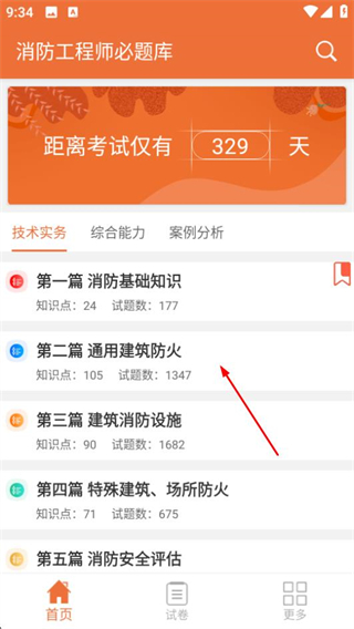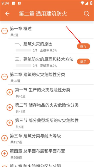 1、在消防工程師必題庫首頁,點擊第二篇通用建筑防火選項,進入對應篇章頁面。