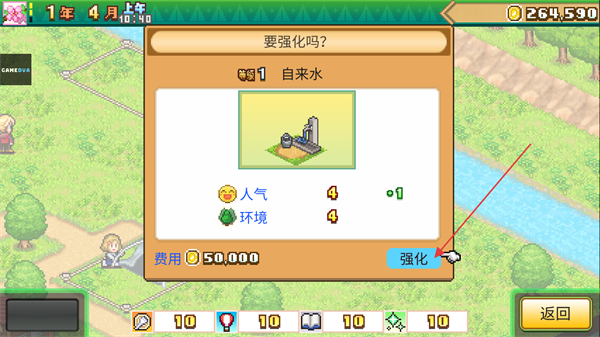 4、設(shè)施建造完成后,觸發(fā)強(qiáng)化選項(xiàng),消耗50000金幣點(diǎn)擊強(qiáng)化,提升設(shè)施的人氣和環(huán)境屬性。