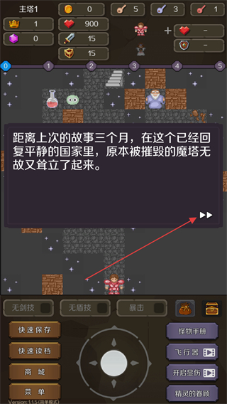 2、進入主塔1后,點擊箭頭按鈕跳過劇情,查看初始屬性與場景元素,做好探索魔塔的準備。