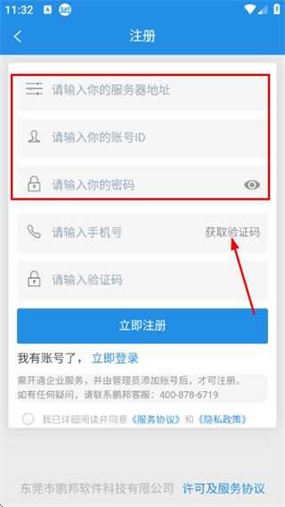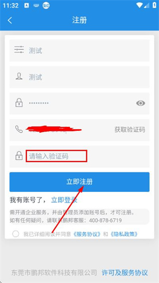 3、在驗證碼輸入框中填寫收到的驗證碼,點擊立即注冊完成注冊操作。