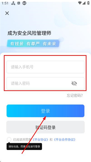3、在登錄頁面填寫手機(jī)號(hào)和密碼,勾選協(xié)議后,點(diǎn)擊登錄完成賬號(hào)登錄操作。