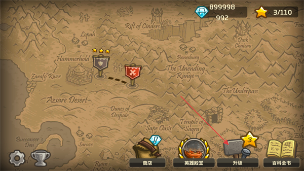 1、在游戲地圖界面,可點(diǎn)擊通過升級(jí)功能強(qiáng)化能力,也能借助商店、英雄殿堂籌備資源,推進(jìn)關(guān)卡進(jìn)度。
