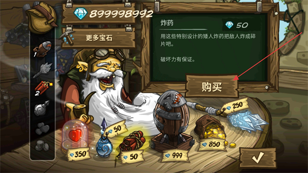 3、在商店界面里,消耗寶石點(diǎn)擊購買可獲取炸藥,該道具能將敵人炸成碎片,提升戰(zhàn)斗破壞力。