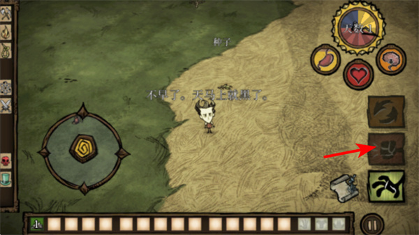 3、當(dāng)天色變暗前,需快速收集足夠的資源如木材、草,點擊建造按鈕可制作火把,火把在夜晚提供光源怪物,保障角色安全。