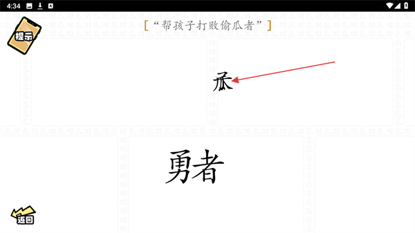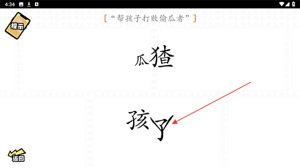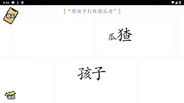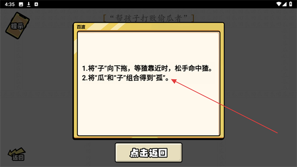 2、該提示界面展示了幫孩子打敗偷瓜者的操作步驟,拖動文字子命中猹、組合瓜與子得到孤,按步驟操作后點擊返回回到關(guān)卡界面。