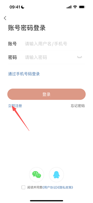 2、在賬號密碼登錄頁面,點擊立即注冊選項,進(jìn)入手機(jī)號輸入頁面。