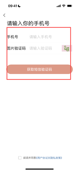 3、在手機(jī)號輸入頁面,填寫手機(jī)號、圖片驗證碼后,點擊獲取短信驗證碼按鈕。