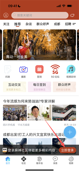 麻辣社區(qū)是專為四川打造的本地綜合社區(qū)平臺,聚焦四川本地民生資訊、網(wǎng)絡(luò)問政等核心內(nèi)容,第一時間推送惠民政策與本地動態(tài),讓用戶精準(zhǔn)捕捉關(guān)鍵信息不再錯過利好福利,同時設(shè)有熱門旅游、生活分享等多元話題板塊,匯聚本地?zé)衢T旅游資訊與好去處推薦,支持用戶參與話題討論、交流生活經(jīng)驗。