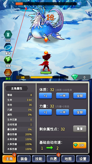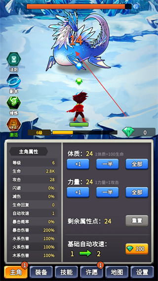 1、在戰(zhàn)斗界面分配屬性點,點擊體質(zhì)力量的+1按鈕,提升主角生命與攻擊屬性,對戰(zhàn)冰龍。