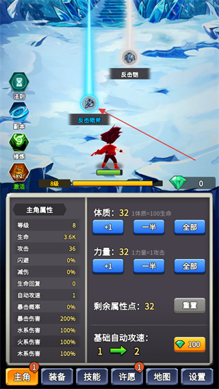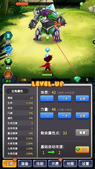 2、持續(xù)戰(zhàn)斗擊敗冰龍,主角等級提升,屬性數(shù)值隨之增長,積累屬性點。