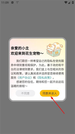 1、在花生寵物的歡迎彈窗中,點(diǎn)擊同意并進(jìn)入按鈕,進(jìn)入登錄頁(yè)面。