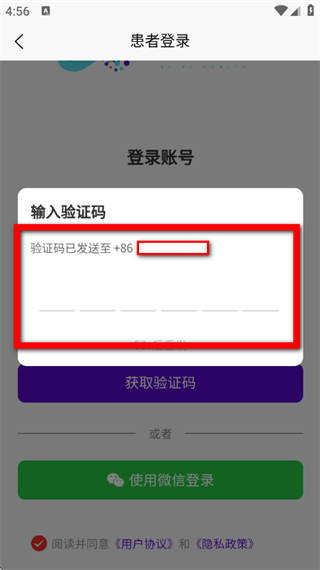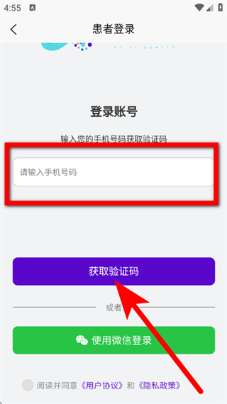 3、在登錄頁面,輸入手機號碼,勾選協(xié)議后,點擊獲取驗證碼。