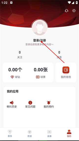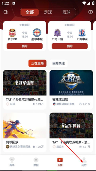 1、在賽事直播首頁(yè),點(diǎn)擊底部我的,進(jìn)入個(gè)人中心頁(yè)面。