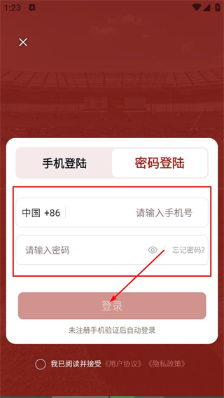 4、在密碼登錄頁(yè)面,填寫手機(jī)號(hào)和密碼,點(diǎn)擊登錄,完成賬號(hào)登錄。