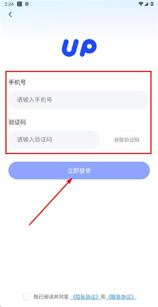 3、在登錄頁(yè)面填寫(xiě)手機(jī)號(hào)和驗(yàn)證碼,勾選協(xié)議后,點(diǎn)擊登錄完成賬號(hào)登錄操作。