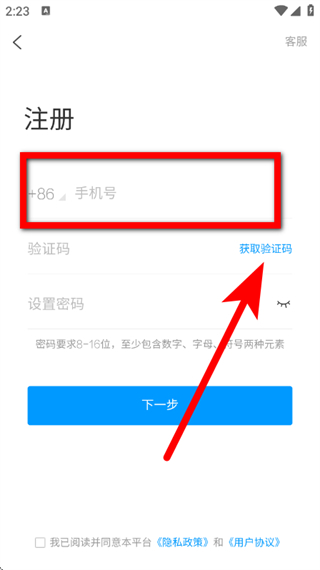 3、在注冊(cè)頁面,輸入手機(jī)號(hào),點(diǎn)擊獲取驗(yàn)證碼。