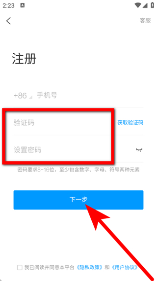 4、輸入驗(yàn)證碼并設(shè)置密碼,勾選協(xié)議后,點(diǎn)擊下一步,完成注冊(cè)。