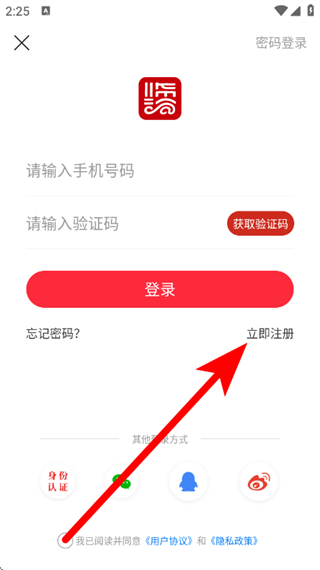 3、在登錄頁面,點(diǎn)擊選擇立即注冊,進(jìn)入注冊頁面。
